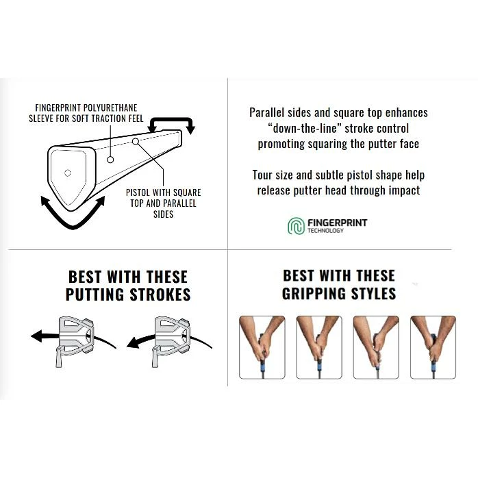 - Unique accentuated square top pistol putter grip